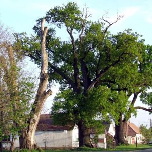 Az út mellett álló két terebélyes kocsányos tölgy korát több mint 380 évesre becsülik. A harmadik tölgynek ma már csak a kiszáradt törzse látható. A helyi hagyomány szerint e tölgyek árnyékában pihent meg országjárása során IV. Béla király, később pedig egyik hadjárata során II. Rákóczi Ferenc. Az középső fa előtt Bácska török uralom alóli felszabadulásának 300. évfordulójának emlékére emelt kiskápolna áll. A tölgyek a település címerében is megjelennek.